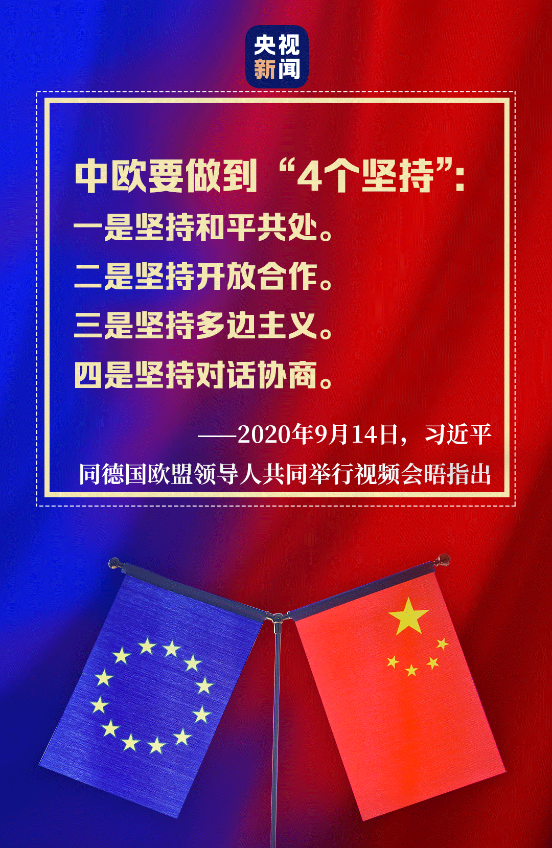 中欧相互尊重、求同存异、和而不同,不断增进彼此理解和信任,在合作中扩大共同利益,在发展中破解难题。在当天的视频会晤中,习近平强调,中欧要做到“4个坚持”。