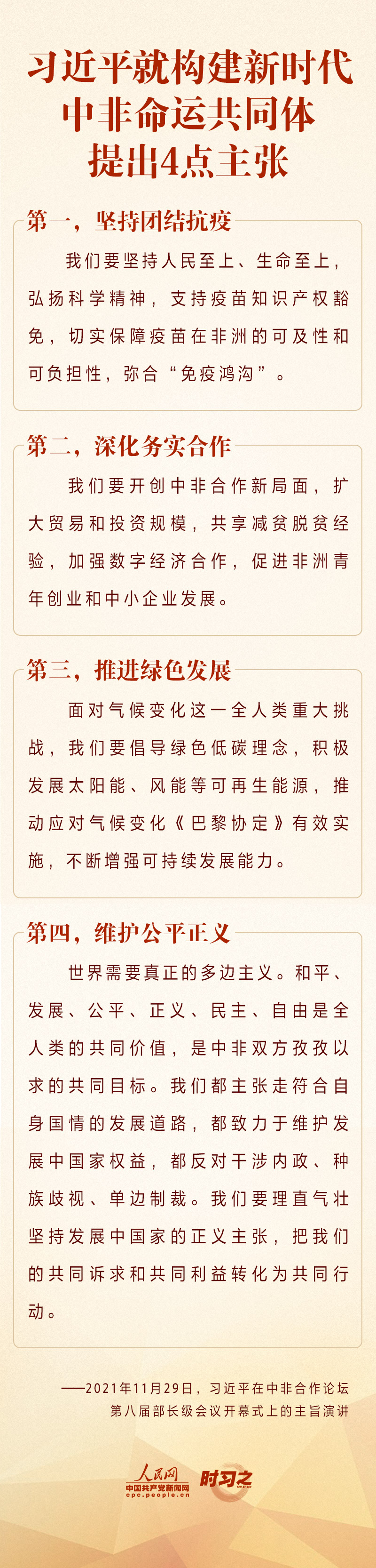 11月29日晚,国家主席习近平在北京以视频方式出席中非合作论坛第八届部长级会议开幕式并发表主旨演讲。习近平就构建新时代中非命运共同体提出4点主张,并指出,作为《中非合作2035年愿景》首个三年规划,中国将同非洲国家密切配合,共同实施“九项工程”。