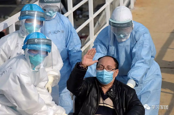 重症患者出院:1月28日中午,59岁的武汉市民刘桂芝在空军军医大学医疗队专家陪同下,缓缓走出武昌医院。当天,有两名军地联手治愈的肺炎重症患者出院。(图片来源:军报记者微信公众号)