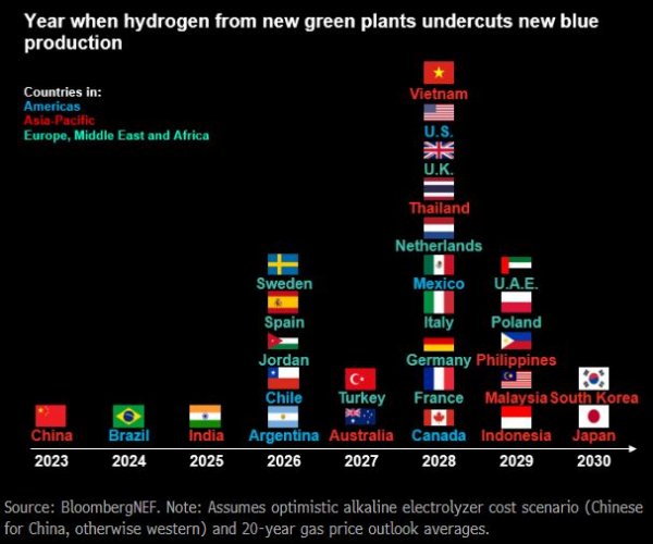各个国家绿色氢价格低于蓝色氢达成时间表(来自:BNEF)