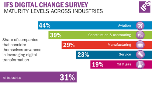 全球领先的企业级应用软件提供商IFS (艾菲诗软件) 近日发布了面向工业制造、石油和天然气、航空航天、施工及承包、服务等多个行业的数字化转型成熟度调研结果,此次调研数据采集于来自16个国家的750名企业资深决策者。
