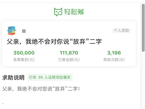 众人拾柴火焰高,在轻松筹上很快就有三千多人献出爱心,一点点的爱心汇聚成了11万元善款,张晓一家的困镜得到缓解。