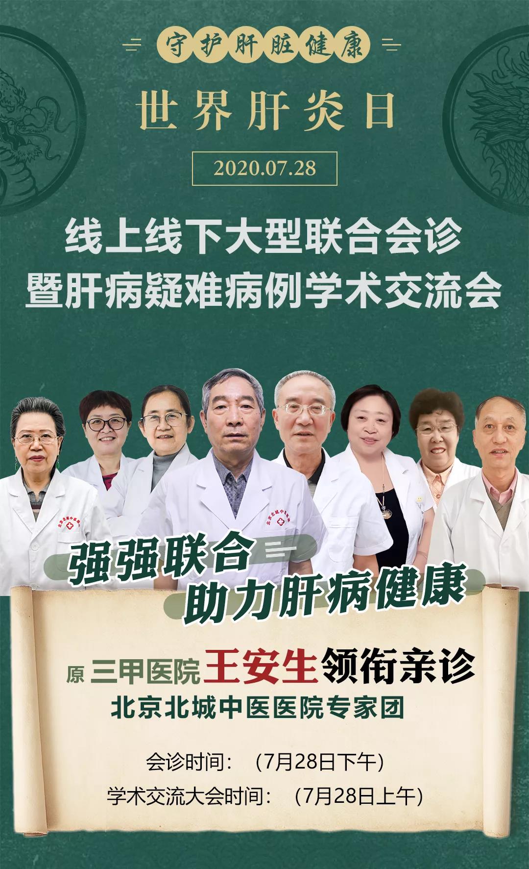 北京北城中医院将于7月28日开展2020“世界肝炎日·线上线下大型联合会诊暨肝病疑难病例学术交流会”活动,届时,由原解放军302医院知名肝病专家王安生教授领衔携手清朝郑氏御医后人郑继红主任联合开展多学科一体化及联合会诊。