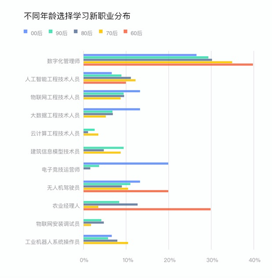 《报告》显示,用户对于数字化技能的偏好,成为新职业时代的显著特点。数字化管理师、无人机驾驶员、人工智能工程技术人员、农业经理人、物联网工程技术人员成为用户最想学习的新职业。其中,60后偏爱农业经理人,00后偏爱电子竞技运营师。