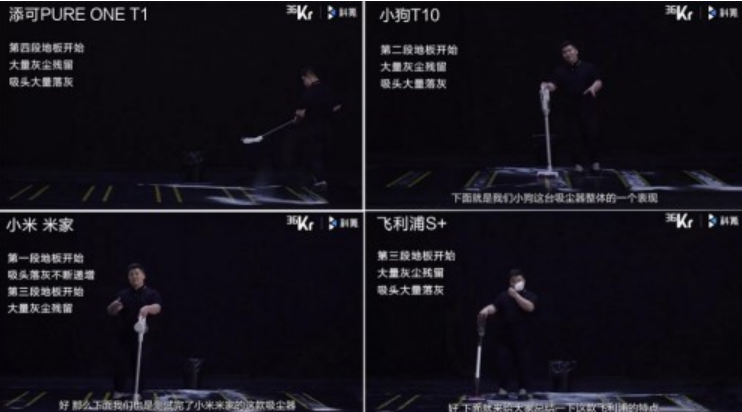 而且,这张图的实验结果已经很明显了,除了戴森没有白色的烟雾喷出,其他几款吸尘器都没有办法做到真正有效的过滤。像是大作熟知的网红产品添可PURE ONE T1和莱克M12s的吸尘器都会有白色的烟雾喷出,也就是说这些产品没有办法真正的有效过滤脏东西。