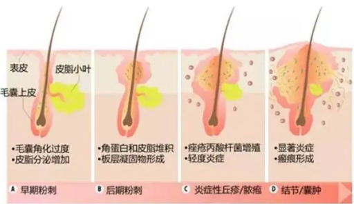 不同类型的痤疮主要是由毛囊不同深度的炎症及其继发的炎症反应造成的。