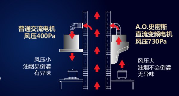 再加上越来越多的大厨房、开放式厨房设计,与之相对应的烟机风压值也要随之提升,例如替换为最大静压值730pa的A.O.史密斯顶侧双吸油烟机,就能很好的避免出现油烟逸散、倒灌的情况。