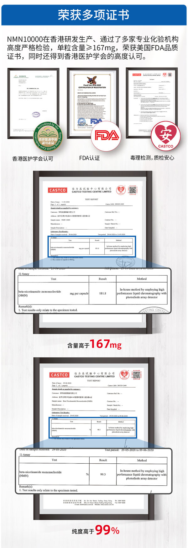 莱特维健NMN10000采用绿色生物酶定向技术研发,吸收迅速,每瓶含量高达10000毫克,与同类产品对比,在含量及纯度方面更胜一筹。莱特维健NMN10000不仅取得香港CASTCO的认证检测证书,香港医护协会推荐,还获得美国FDA证书,更是仅有的一款有明星代言的NMN产品。2020年6月,香港著名影星阿Sa官宣代言莱特维健,成为香港莱特维健新的品牌形象代言人。