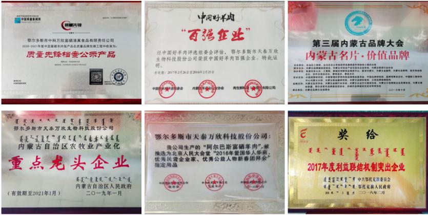 2017年11月10日,第四届内蒙古品牌大会在呼和浩特召开,这个大会见证了内蒙古自治区品牌的创新与成长。在此次大会上,天泰万欣从众多品牌中脱颖而出,得到参会专家和企业家的一致好评,以2.35亿元的品牌价值与伊利、蒙牛、燕谷坊等100家企业共同荣登“2017内蒙古名片百强品牌榜”;天泰万欣系列产品荣获“2017内蒙古名片百佳农特推荐产品”;董事长伊拉塔先生更是荣膺“2017内蒙古品牌人物—内蒙古品牌建设榜样奖”。2018年,经过中科院、农科院,国家卫计委等相关专家的评审鉴定,天泰万欣与中国科学院共同获得两项发明专利:牛用富硒饲料及其喂食方法和羊用富硒饲料及其喂食方法。在第十六届中国国际农产品交易会上,鄂尔多斯市天泰万欣生物科技股份有限公司阿尔巴斯富硒炖羊肉罐头荣获国际农交会金奖。