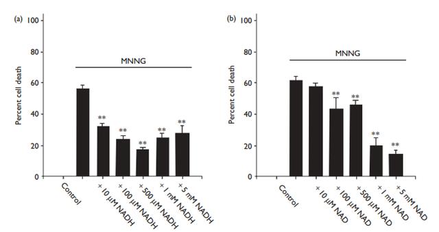 上图可以看出,10uM的NADH就能显著降低细胞死亡率,而NAD+至少要加到100uM才能明显降低细胞死亡率。说明NADH对细胞的保护作用比NAD+更强。