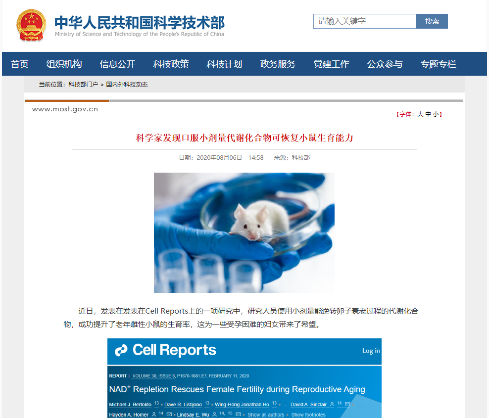 2020年2月新南威尔士大学医学院Lindsay E. Wu的研究组发表于Cell子刊的研究发现,NADH和NADPH在卵母细胞中的水平随着年龄的增长而下降,导致小鼠的卵母细胞功能失调,生育力下降。并证明对处于繁殖期而不孕的雌鼠补充NMN后可提升卵母细胞的NADH和NADPH水平,从而恢复卵母细胞质量,提高排卵率和生育能力。