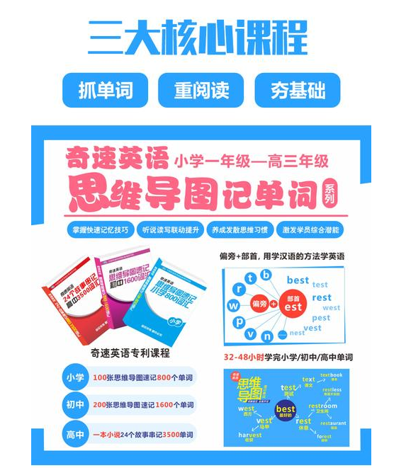 其次,奇速英语采用全国独家“故事记单词”“思维导图记单词”“黄金语法”“奇速阅读法”“话题满分作文法”帮学生快速提高成绩。以《奇速英语24个故事48小时串记高中3500词汇》奇速英语思维导图16次课32小时串记初中1600词汇》《奇速英语思维导图16次课串记小学800词汇》为代表的词汇课深受全国欢迎;《奇速英语快速阅读法》一快二准,快速提高阅读完型技巧及成绩。快速阅读妙招,招招致胜;完型名师点拨,直戳考点,深度挖掘阅读理解失分根源并对症下药。《奇速英语话题满分作文法》独创书面表达“左2右6”“妙笔生花”,常用词汇、常用句式和经典语段,满分作文展示及优秀范文点评,话题写作实战操练。更有学习书籍售卖。