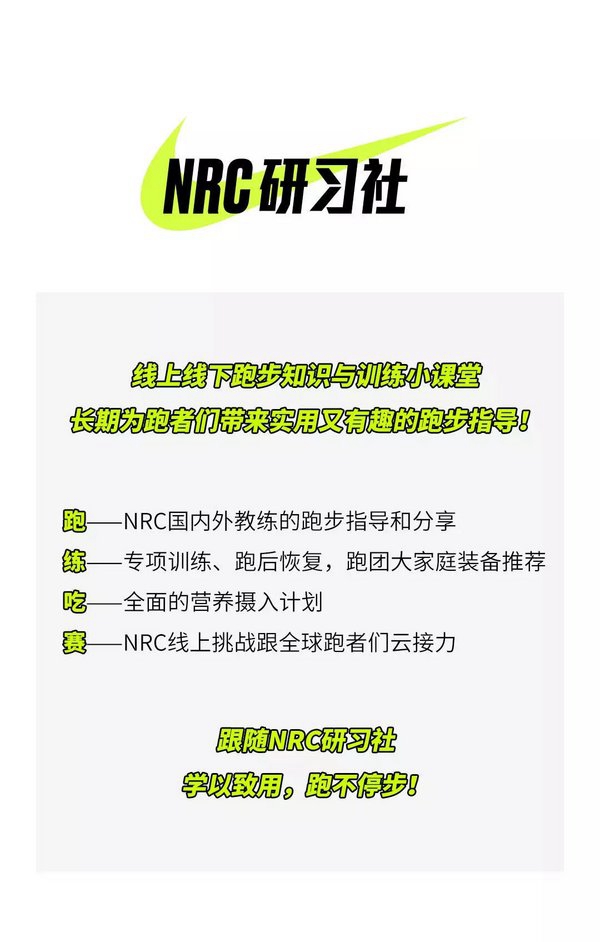 在中国大陆地区,“NRC研习社”将再次以全新面貌回归,今年无论你是跑步小白还是大神,无论目标是最快5公里、10公里或者42公里,都可以通过Nike Run Club APP/微信平台的“NRC研习社”栏目,获取科学的训练安排、专业的教练指导和跑步相关体能、恢复及营养知识,还有真实跑者的上脚推荐。