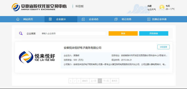 2020年4月,安徽悦来悦好电子商务有限公司顺利通过审查,在安徽省股权托管交易中心科技创新专版基础层正式挂牌。证券代码:613591。