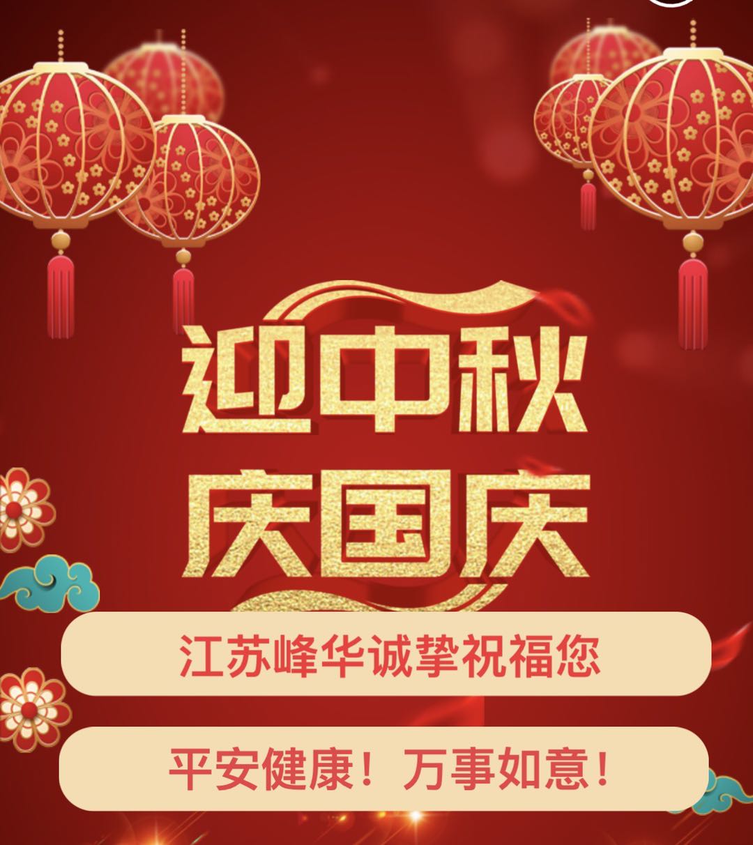值此国庆、中秋双节之际,范宝华董事长代表峰华空调设备有限公司衷心地祝福伟大的祖国繁荣昌盛,祝福全国人民阖家安康、双节快乐!