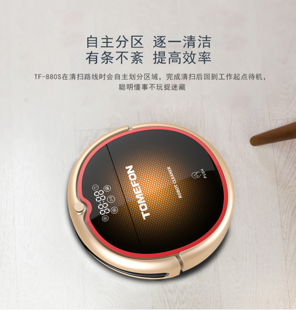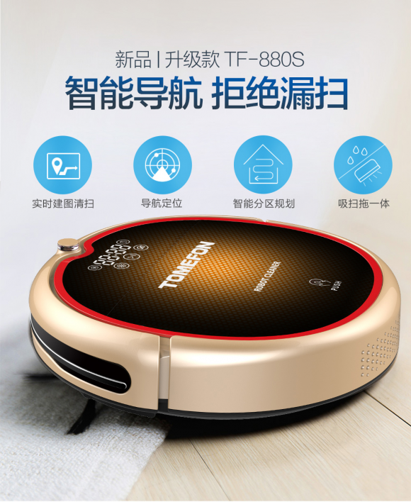 小编是个颜控,在看到斐纳TOMEFON-TF-880S智能扫地机器人的第一眼就喜欢上了它,这款扫地机器人采用香槟色与黑色搭配,红色包边时尚又醒目,不愧是获得设计大奖的机型。斐纳TOMEFON-TF-880S智能扫地机器人的导航认路能力也是一流的,配置有斐纳TOMEFON最新的智能芯片和导航技术,单次扫描直径达到10米,扫描频率高达500次/秒,可以对150平米面积进行精确导航。
