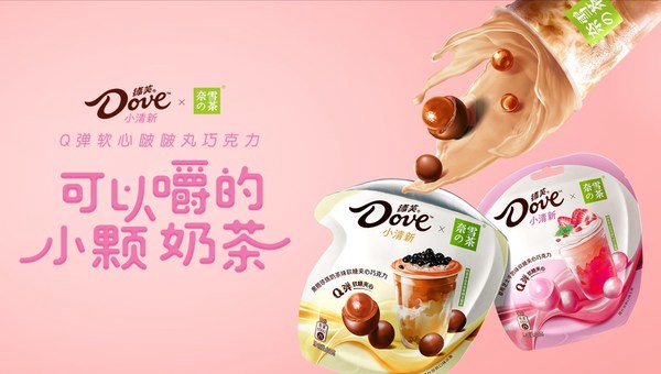 德芙天猫美食超级CP日新品“嚼着吃的小颗奶茶“,Q弹软心,多重味蕾享受。包装色彩搭配得可爱又清新,瞬间抓住眼球,非常契合年轻人的高颜值追求。小小一颗既能尝到奶茶的醇香,又能感受到巧克力的丝滑。