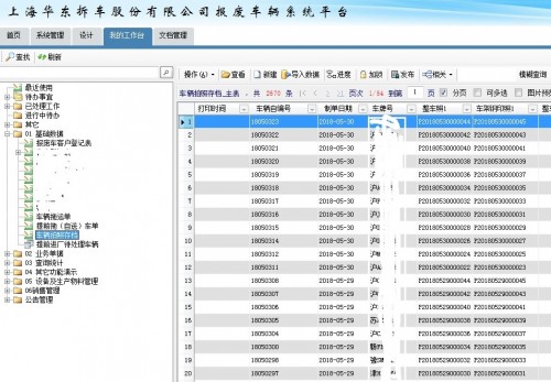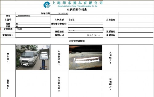 公司的对于进厂的车辆,首先在《报废车客户拖运登记表》中录入相关车辆信息,然后对车辆进行派单拖运,对进厂车辆进行登记,首先在《车辆拍照存档》模块中录入相关信息,并且对车辆进行拍照存档,手续齐全的车辆进行《报废车收车单》登记。2.2验车管理: