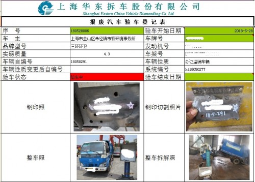 公司对车辆进行查验登记,检查车辆是否缺件,并登记《》,上传相关车辆的照片,待拆解后,上传相关拆解照片。