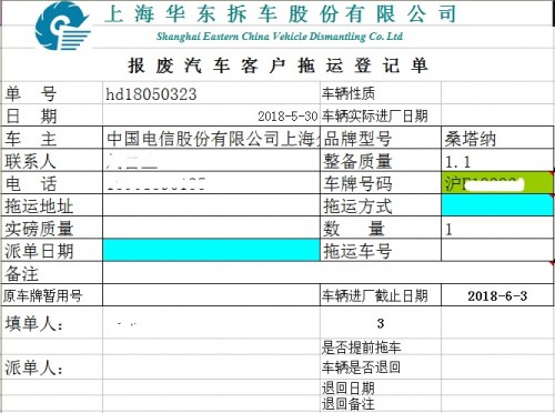 《报废车客户拖运登记表》