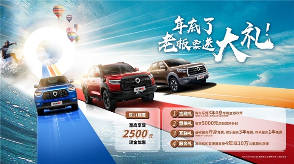 如果看到这里你还是拿不定主意,那不妨去11月11号的长城超级砍直播间,届时有汽车KOL南哥携手品牌Boss进行趣味直播,对长城炮进行全方位解读。当然礼物也少不了,双十一当天在原有政策基础上,长城炮乘用皮卡汽油版再降500RMB,长城炮乘用皮卡柴油版和商用皮卡加赠一次基础保养,长城炮越野皮卡下单就送长城炮越野皮卡车模,简直不要太过瘾!
