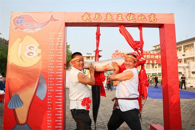 丹江渔民扛着长1.5米,重近百斤的鱼王走上主舞台,向四海来宾展示着丰收的喜悦。