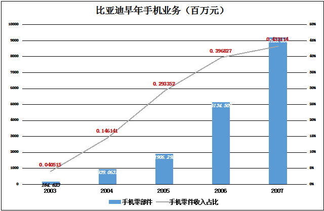 2003年起,比亚迪就开始招兵买马,陆续推出屏幕、镜头模块、键盘机壳模具、软性电路板等产品,几乎覆盖所有的手机零组件,进而“顺理成章”地开展手机组装业务。