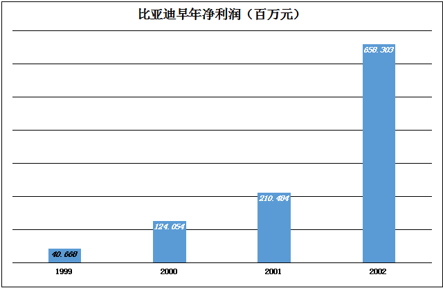 由于锂离子电池附加量更高,比亚迪效益全面改观,2002年毛利润率、净利润率分别达到41.7%和28.7%,成为劳动密集型企业中的“奇葩”。适逢手机产业大爆发,锂离子电池需求“井喷”,比亚迪崛起有运气的成份。但是能拿到40%以上的毛利润率,说明比亚迪在电池在技术方面“有一套”。