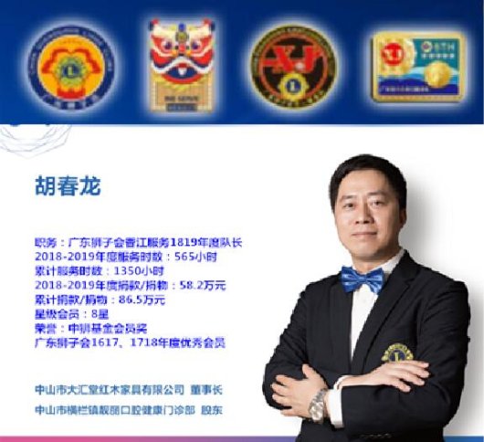 胡春龙狮兄:广东中山狮子会香江服务队2018-2019年度队长、广东狮子会中山代表处2018-2019年度GST主席(GST中文全称:全球服务团队)、(慈善爱心公益企业家:中山大汇堂红木董事长胡春龙先生、中山唐百年家具董事长胡春龙先生、中山横栏靓丽口腔老板胡春龙)