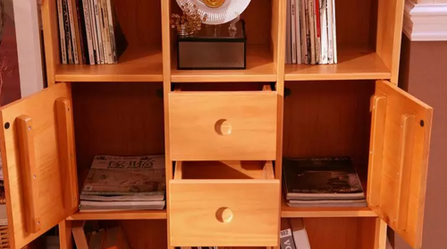 书柜中部为抽储+门柜的组合。不常用的书籍和小杂物都可以收进去。另外还有3个底柜可以拿来收纳,家里有再多的书也不怕无“藏身之所”了。