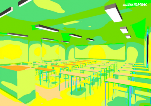 学生视力得到改善,是离不开改造后的教室照明质量。为使教室光环境达到一个良好的水平,三雄极光根据教室内讲台教学区和学生座位区不同的功能,运用照明设计模拟软件,科学地计算出国家标准规定的教室所需的光环境,以针对性强、多元化的布灯方式,降低能耗,保障照度均匀、明亮。
