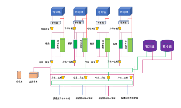在我国大量的运营商和第三方数据中心里,冷却塔+板换+冷水机组的水系统架构非常流行,这种架构虽然比较复杂,对建设过程要求较高,但对建筑形式要求较低,不受温度和湿度影响,关键是非常成熟,国内的大多数设计院很喜欢出这种方案。