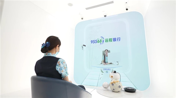 在智能服务区域,线上线下无缝链接,营造无障碍、协同化、开放型服务,实现以客户为坐标的全旅程陪同体验。远程银行体验舱作为“智慧银行体验店”核心亮点之一,基于民生银行“足不出户、触手可及”的远程银行服务能力,将BOE(京东方)4K高清视频技术与5G高速网络传输相结合,为客户打造智能、私密、便捷的沉浸式服务体验,展现面向未来、随身而行的专业金融服务。