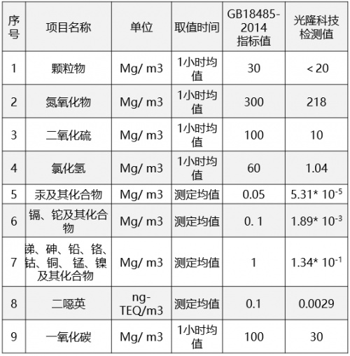 该技术经中科院大连化物所对烟道中的废气和重金属等项目的检测,检测值远远低于国标要求排放标准, 仅为国内排放标准GB18485-2014指标值的3%—10%(比值对照表如下)。具有投资小、占地少、能耗低、排放净、标准高、安全环保六大优势。凭此优势,低温磁化技术获得国家产知识权局专利(专利号202011475663.0)。