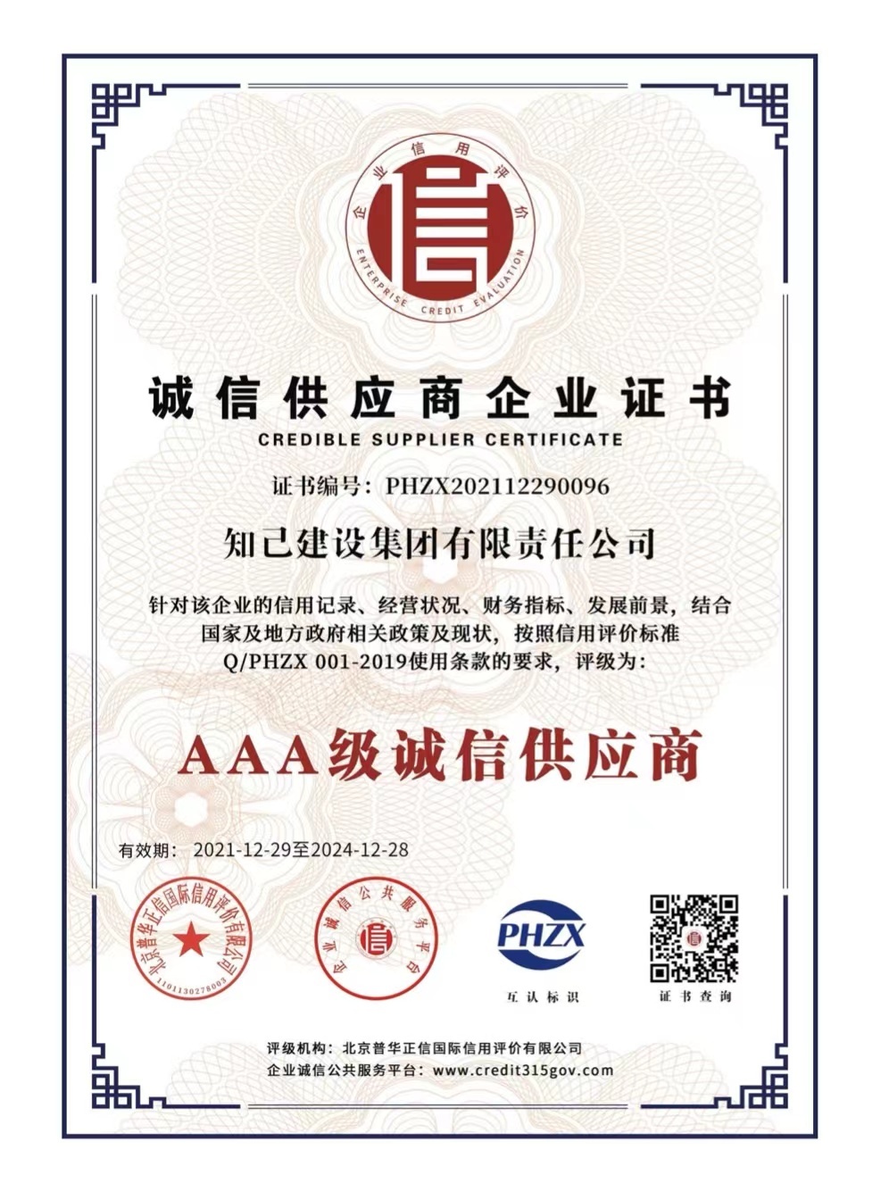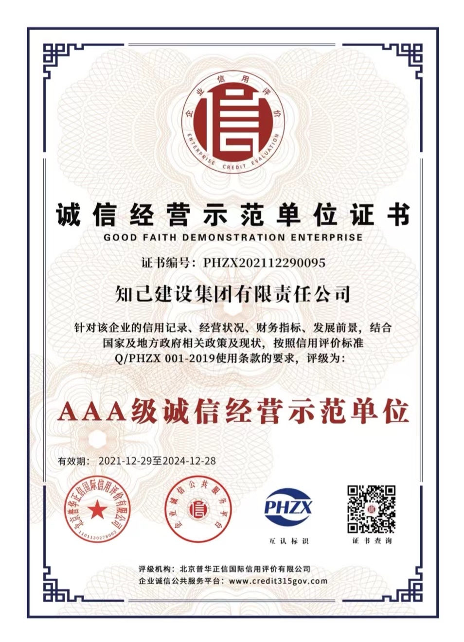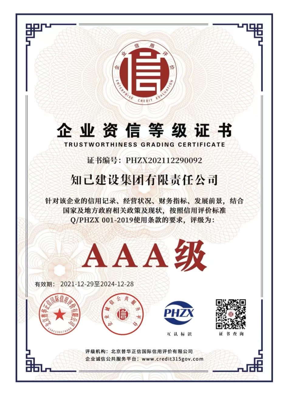近日,知己建设集团有限责任公司完成了企业信用评级工作,被全国企业诚信公共服务平台、北京普华征信国际信用评价有限公司评为“AAA级信用企业”“AAA级诚信经营示范单位”“AAA级质量服务诚信企业”“AAA级重合同守信用企业”“AAA级诚信供应商”、立信单位“AAA级”、企业资信“AAA级”。同时,知己集团董事长贲智群被评为“诚信企业家”并获得荣誉证书。