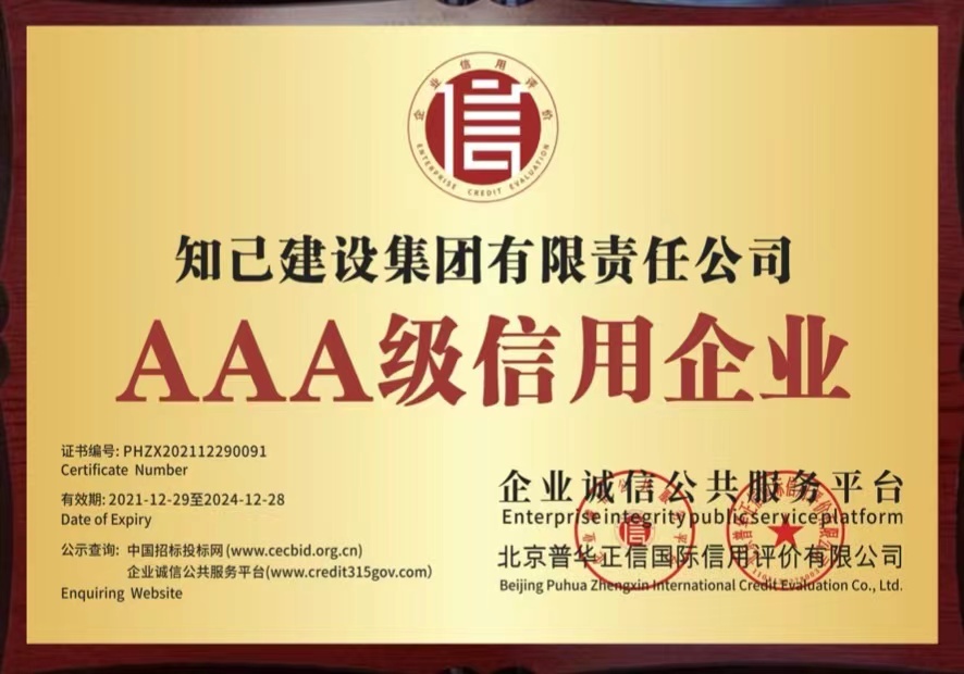 诚信是立业之本,只有守信用的企业,才能得到社会公众的信任。知己建设集团有限责任公司获得AAA级信用评价是行业对知己建设集团有限责任公司诚信经营的认可与表彰,这与知己建设集团有限责任公司多年来坚持诚信经营的企业价值观密不可分。未来,知己建设集团有限责任公司将再接再厉,为社会诚信体系建设添砖加瓦!