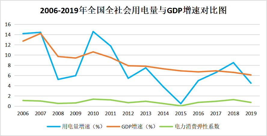 下图是历年我国全社会用电量与GDP增速对比图。