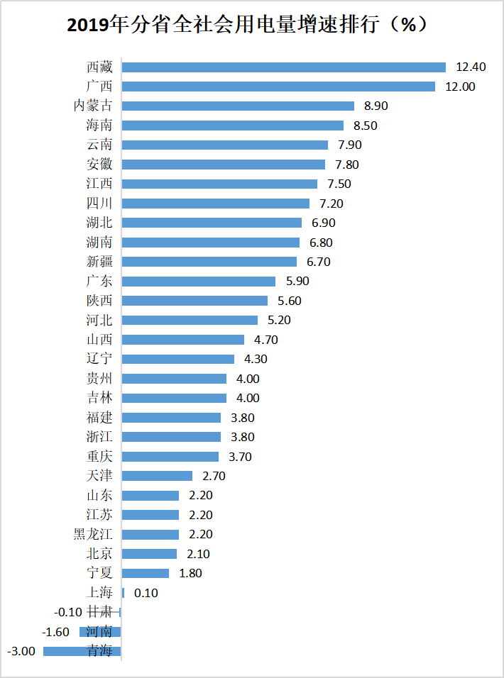 2019年全国分省全社会用电量及增速排行如上两图所示:从用电量看,广东(6696亿千瓦时)第一,西藏(78亿千瓦时)垫底;从用电量增速看,西藏以12.4%的增速排第一,青海(-3.0%)垫底。