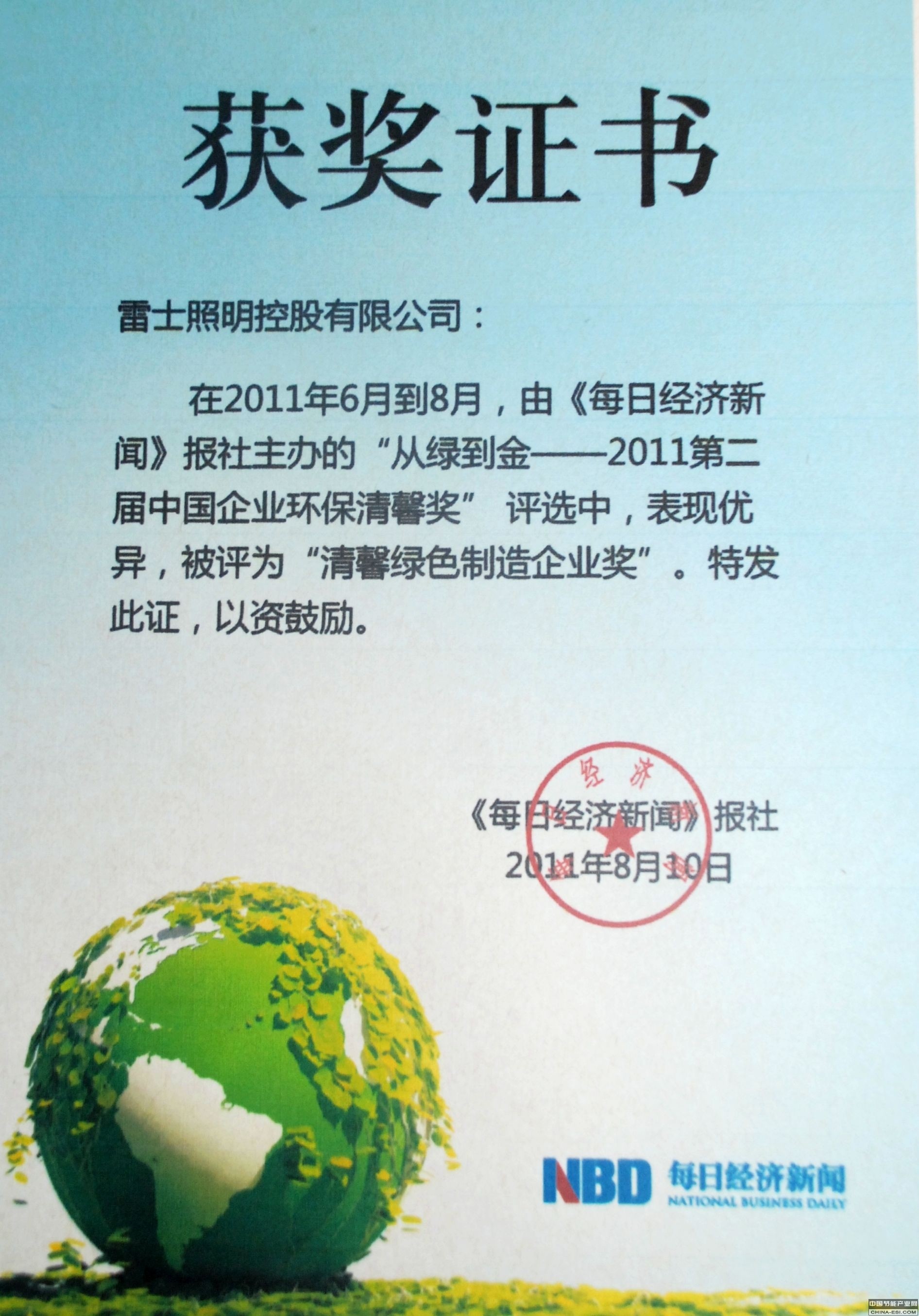 当前,能源和环境危机是全世界共同面对的课题,而照明节能是非常重要的部分,据统计,照明消耗中国总发电量达到13%。发展绿色照明、低碳经济成为政府和社会共同努力的发展方向。雷士照明此次荣获中国企业环保清馨奖,这是主办方对雷士照明在发展绿色照明、推广节能环保产业所贡献的肯定。
