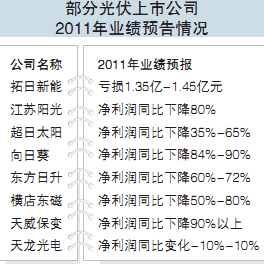 2011年光伏产业陷入低谷,各大企业盈利严重下滑。近期公布的上市公司2011年度业绩预告中,包括拓日新能、江苏阳光等光伏概念公司纷纷下调盈利预期,多数企业业绩惨淡。