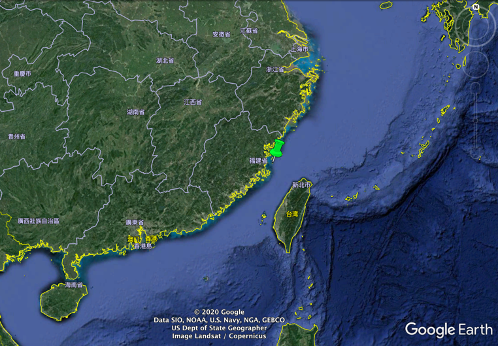 图1 图中绿色坐标点即为本次测试数据的空间位置(26°N, 120°E)