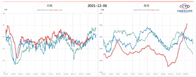 过去10天,虽有寒潮影响,但持续时间较短,全国大部地区气温较常年同期偏高影响,受此影响,自11月下旬,沿海及内陆地区终端耗煤量同比开始走弱,且降幅较大,据CCTD沿海八省终端数据显示,11月下旬以来终端日耗同比降幅在10%左右。