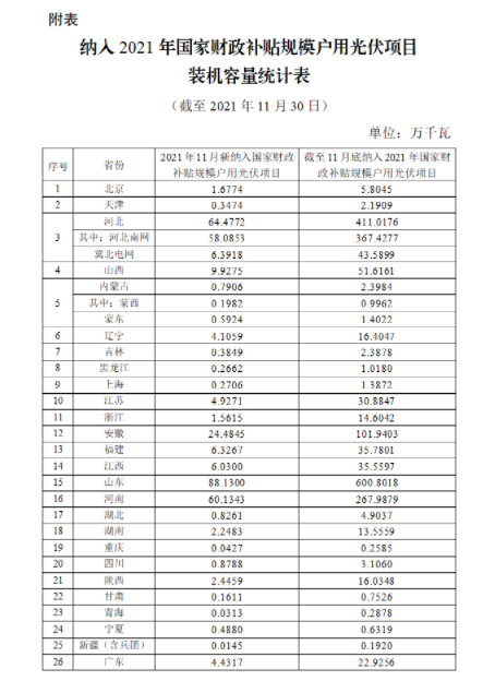 根据各省级能源主管部门、电网企业报送信息,经国家可再生能源信息管理中心梳理统计,2021年11月新纳入国家财政补贴规模户用光伏项目总装机容量为286万千瓦。截至2021年11月底,全国累计纳入2021年国家财政补贴规模户用光伏项目装机容量为1648.86万千瓦。详细情况见附表。