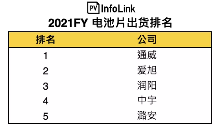 近日, 2021年全年电池片出货量排行榜出炉!