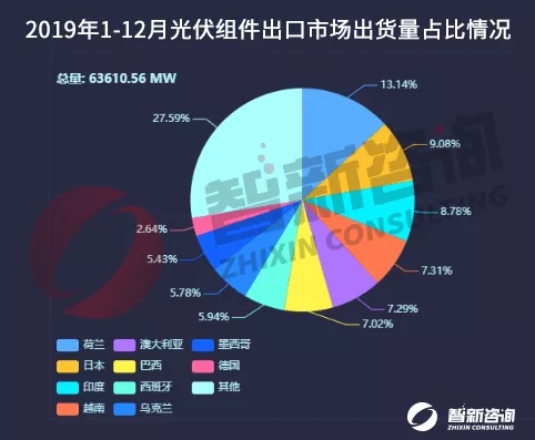从出口区域市场来看,荷兰出货量8.35GW,出口额21.17亿美元,排名第一,日本出货量5.77GW,出口额16.01亿美元,位居第二,印度出货量5.58GW,出口额12.41亿美元,排名第三。