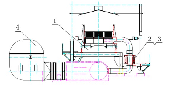1 双层台车 2 液密封环形风道设备 3 环形风道的环向密封装置 4 风机