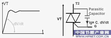 电压上升率的抵制:dv/dt指的是在关断状态下电压的上升斜率,这是防止误触发的一个关键参数。此值超限将可能导致可控硅出现误导通的现象。由于可控硅的制造工艺决定了A2与G之间会存在寄生电容,如图2所示。我们知道dv/dt的变化在电容的两端会出现等效电流,这个电流就会成为Ig,也就是出现了触发电流,导致误触发。