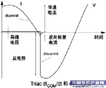 切换电压上升率dVCOM/dt。驱动高电抗性的负载时,负载电压和电流的波形间通常发生实质性的相位移动。当负载电流过零时双向可控硅发生切换,由于相位差电压并不为零。这时双向可控硅须立即阻断该电压。产生的切换电压上升率(dVCOM/dt)若超过允许值,会迫使双向可控硅回复导通状态,因为载流子没有充分的时间自结上撤出,如图3所示。